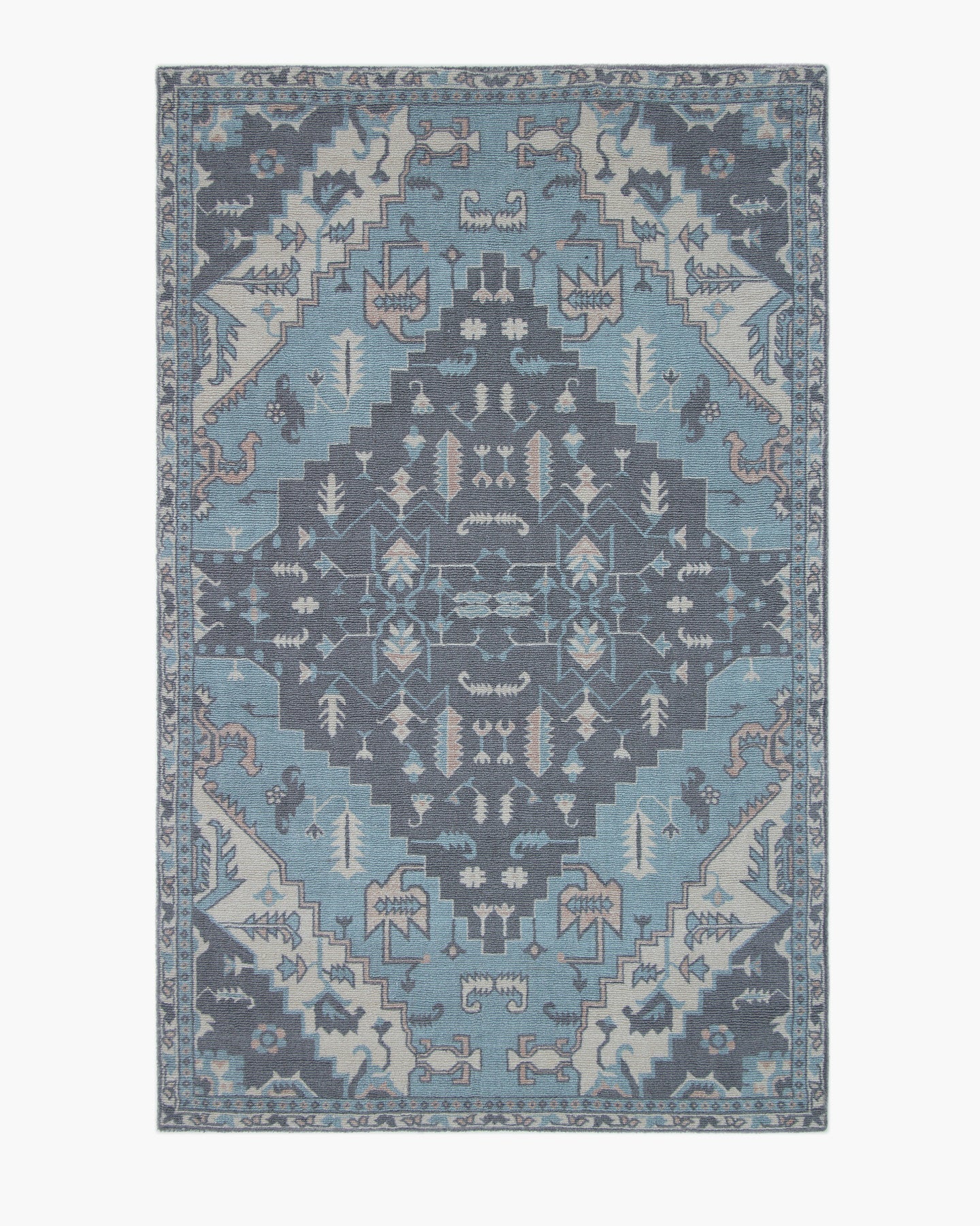 Our natural wool rugs are expertly crafted by artisans in India, making each rug inherently unique. The wool yarns used in our rugs are soft yet strong, making them both comfortable and durable. The Aida Rug features a traditional design that is printed on a tufted base in a blue and grey palette.