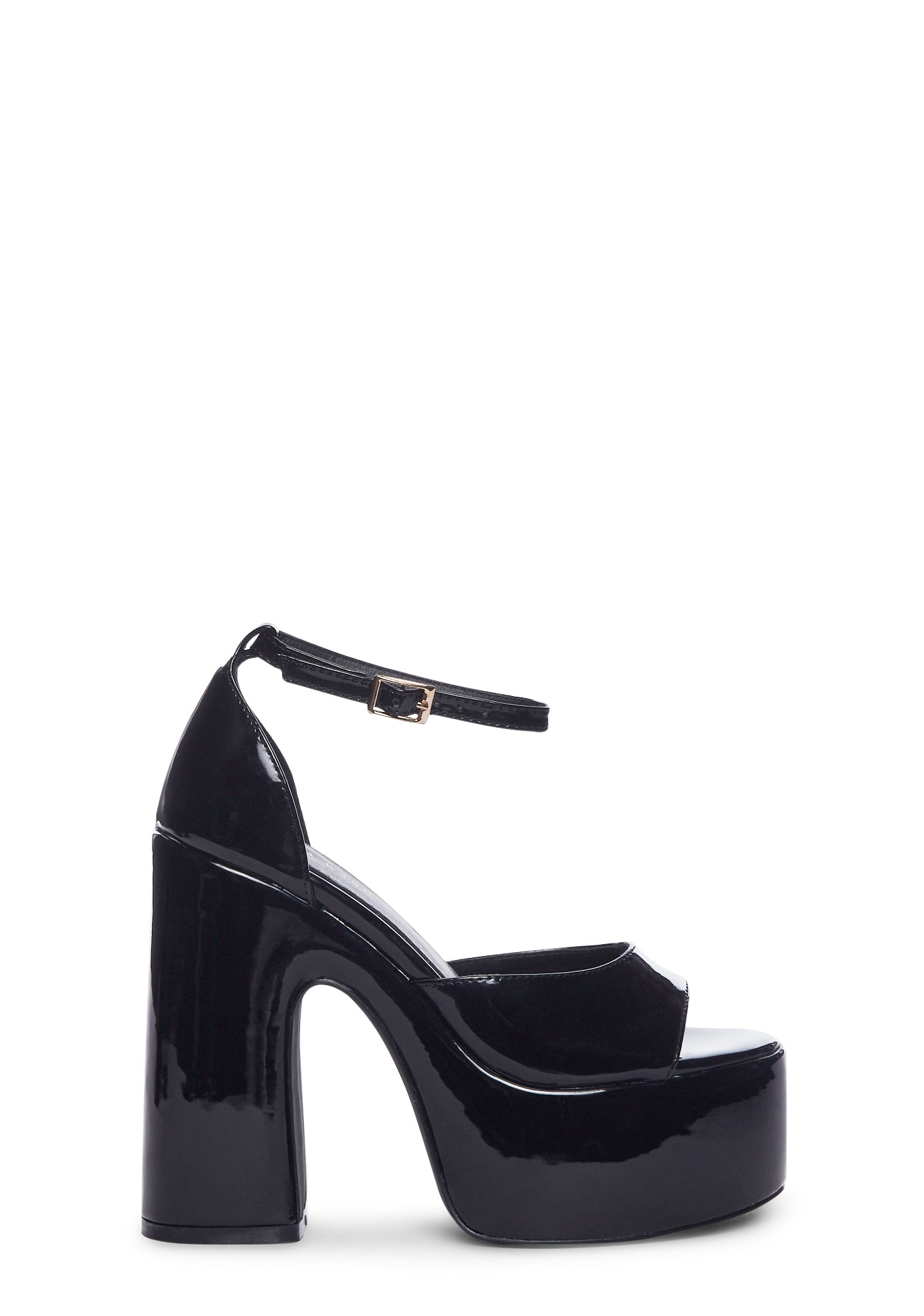cuz do what you wanna do. These platform heels have a patent vegan leather construction, platform soles, block heels, a peep toe design, and ankle buckle closures.