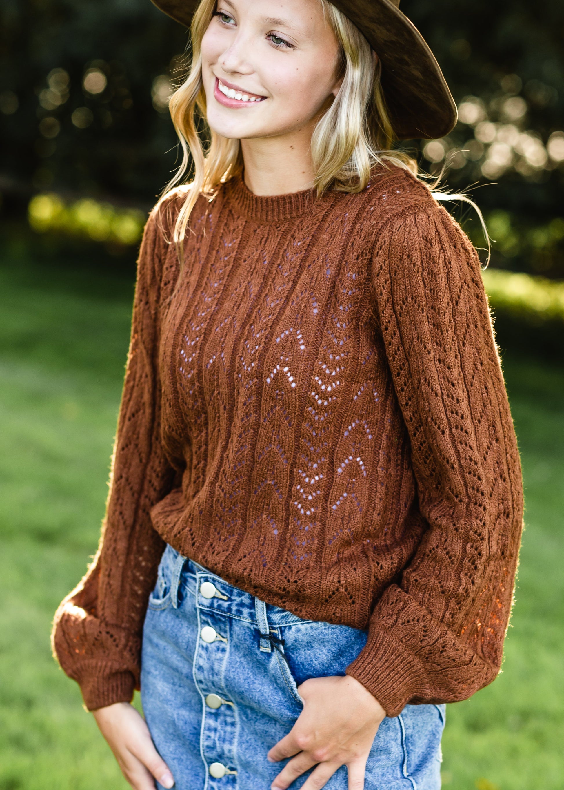 Brown Crochet Bell Sleeve Sweater