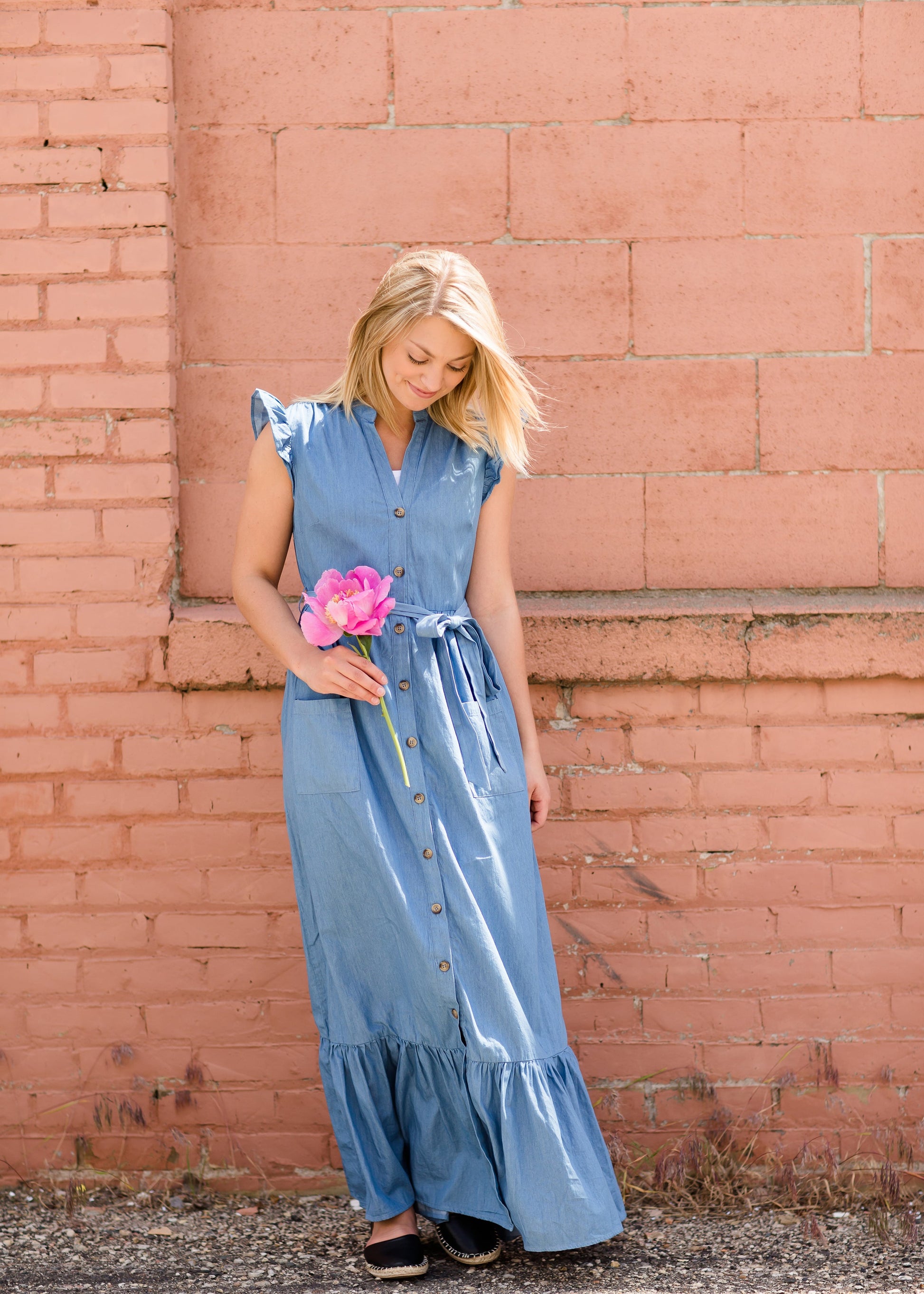 The Button Front Denim Maxi Dress is everything because it features everything that you love. This dress has a button down front, tie waist, cap sleeves, two adorable pockets, and so many more elegant details to make it the perfect fit for you! This dress is flattering with the waist and modest with its beautifully long length!?