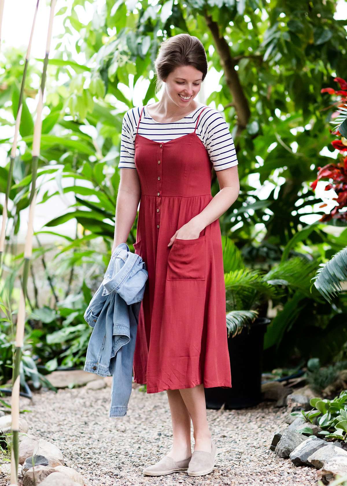 ?We love that we could make this Button up V-Neck Midi Dress modest by adding a simple, comfy tee under it! This women's dress is partially lined and the straps are easily adjustable for you to wear it how it suits you! Paired with your favorite denim jacket and you are set for a fun day out + about!