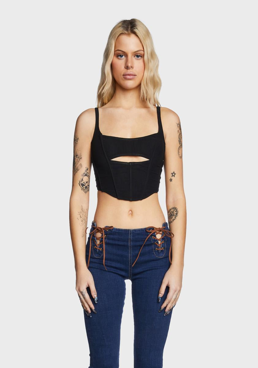 flex on 'em. This cropped corset top has a chest cutout, a boned bodice, and adjustable shoulder straps.