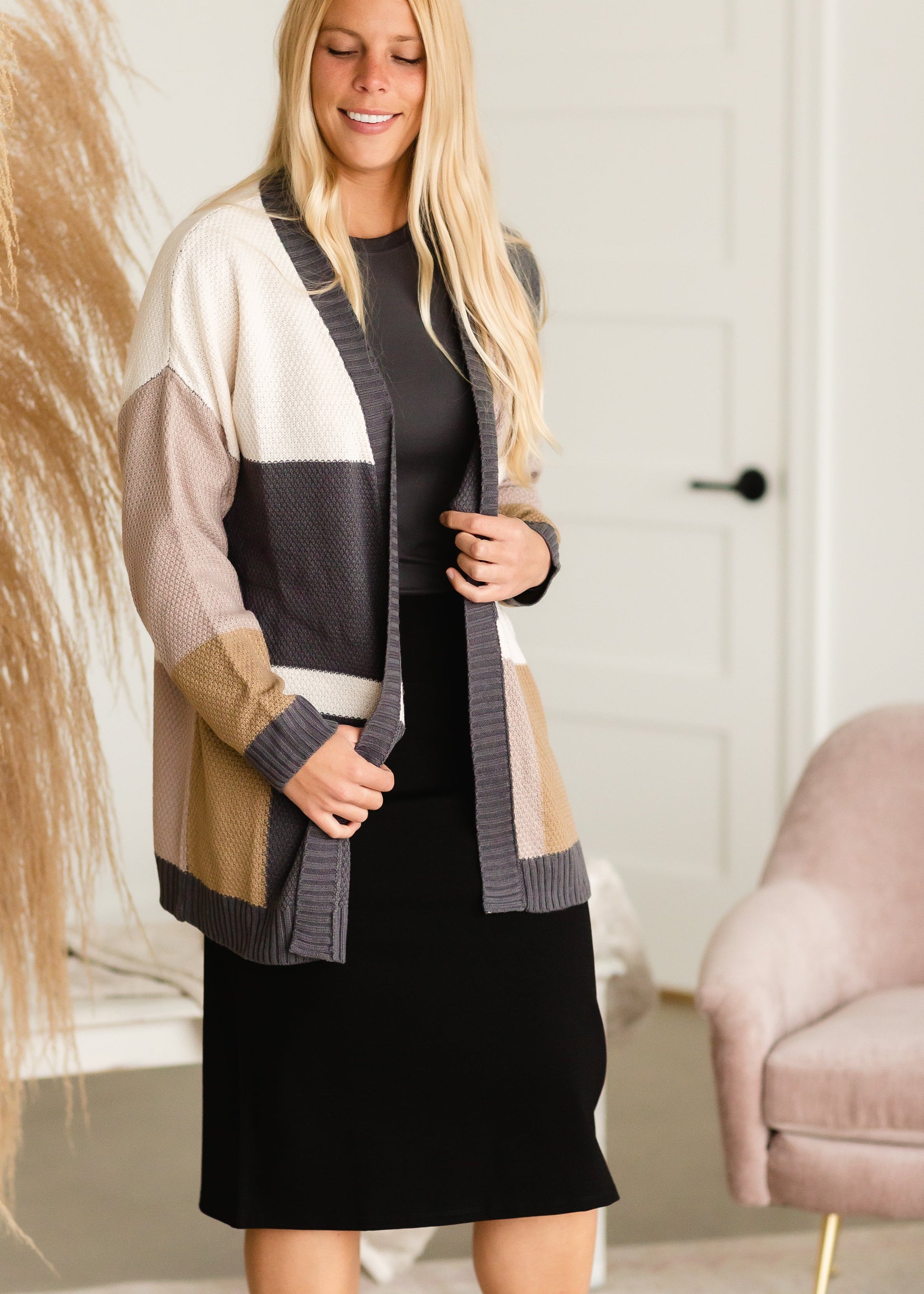 You will love all the black, gray, charcoal and tan colors in this Charcoal Color Block Cardigan! The versatility of pairing this cardigan with a black, denim skirts or khaki midi skirt make this one a closet staple to keep on hand when the air gets a little chilly! You will love the front pockets too - easy to keep track of your keys and cellphone when out and about!