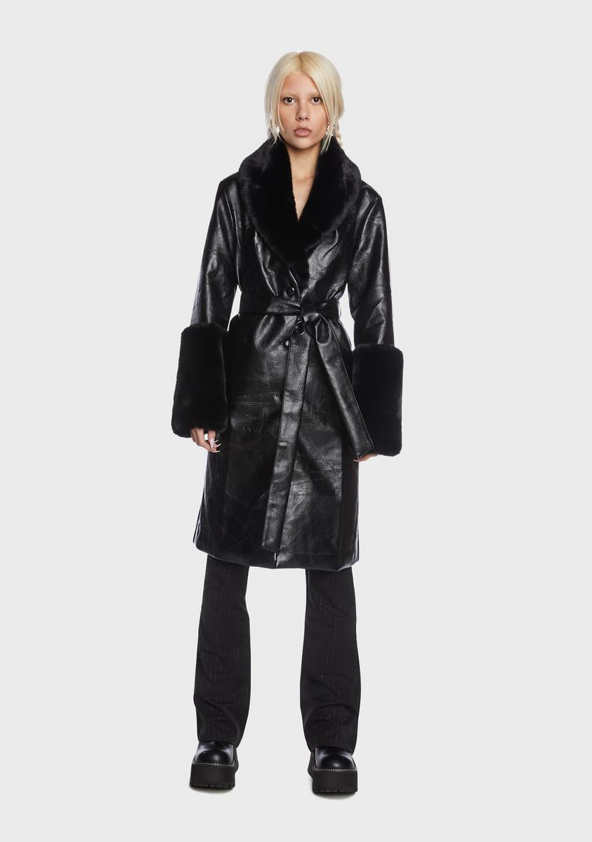 cuz are you on my level? This trench coat has a vegan leather construction, a faux fur trim, long sleeves, side pockets, an adjustable waist belt, and front button closures.