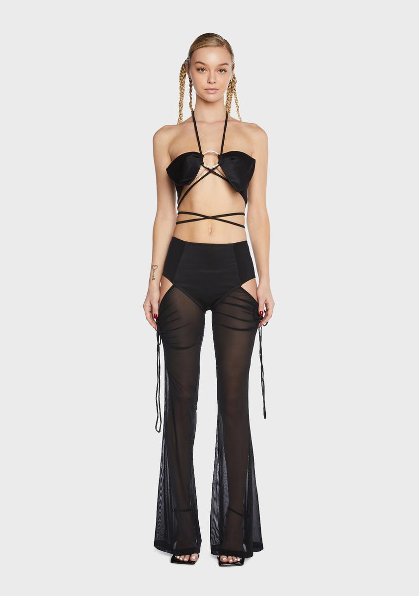 cuz it's their loss. This 2-piece set has a bow bust applique with O-ring hardware, a halter strap, adjustable wraparound waist ties, hip cutouts, adjustable side ties, sheer flared legs. Includes a bra top and mid-rise pants.