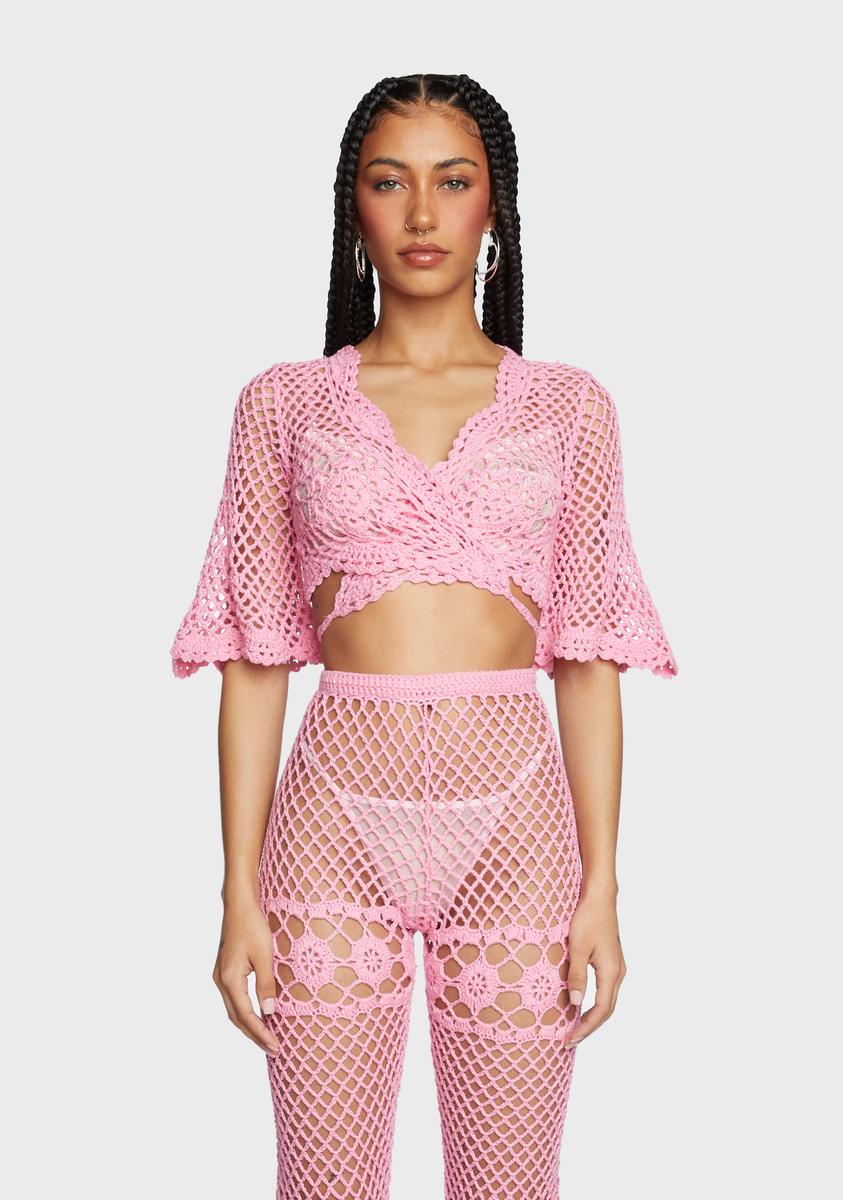 cuz dreaming is free. This top has a sheer crochet construction, mid sleeves, a plunging neckline, a scallop trim, a cropped fit, and wrap tie closures.