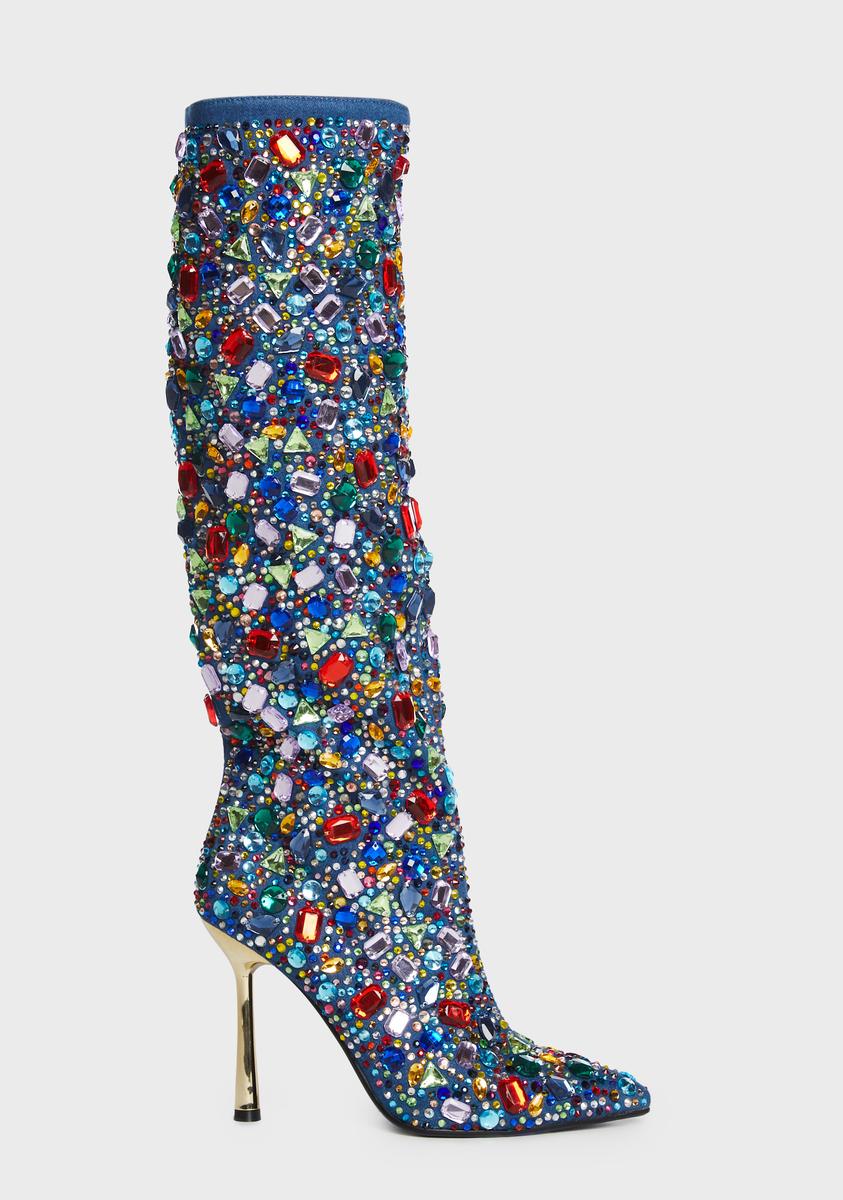 give 'em glam! These knee high boots have multicolored jewel embellishments all over, stiletto heels, pointed toes, and zipper closures.
