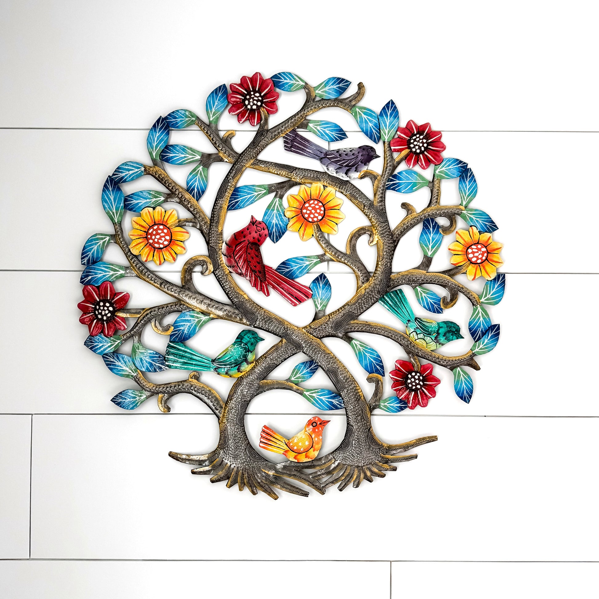 Expertly handcrafted by artisans at Anchored in Hope, the Intertwined Trees Oil Drum Art is a stunning piece of art made from recycled 55-gallon oil drums. Each piece is unique, showcasing the beauty and creativity of Haiti's skilled artisans.
