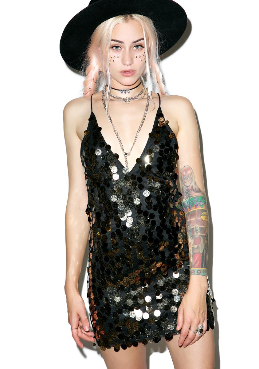 wants to only be tuned in to yew, bb. Stop da tracks of yer future bae with this showstoppin' slip dress featuring allover black n' gold large sequins. With a deep V-neckline and very thin strap detailing in the back, this slinky bb has our attention fer sure.