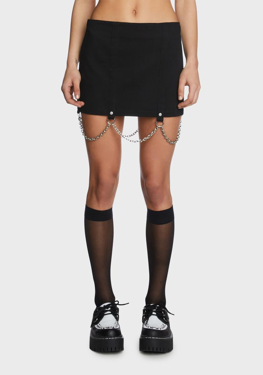 cuz nothing stands in your way. This mini skirt has a non-stretch twill construction, a mid-rise fit, and chain hardware at the hemline.