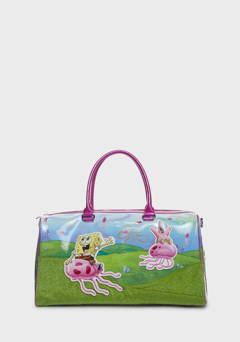just another day in the life. This bag comes in a vinyl construction, with holographic glitter trim details, a jellyfish charm detail, an adjustable and removable crossbody strap, interior pockets, a zip closure, and a Jellyfish Fields print all over