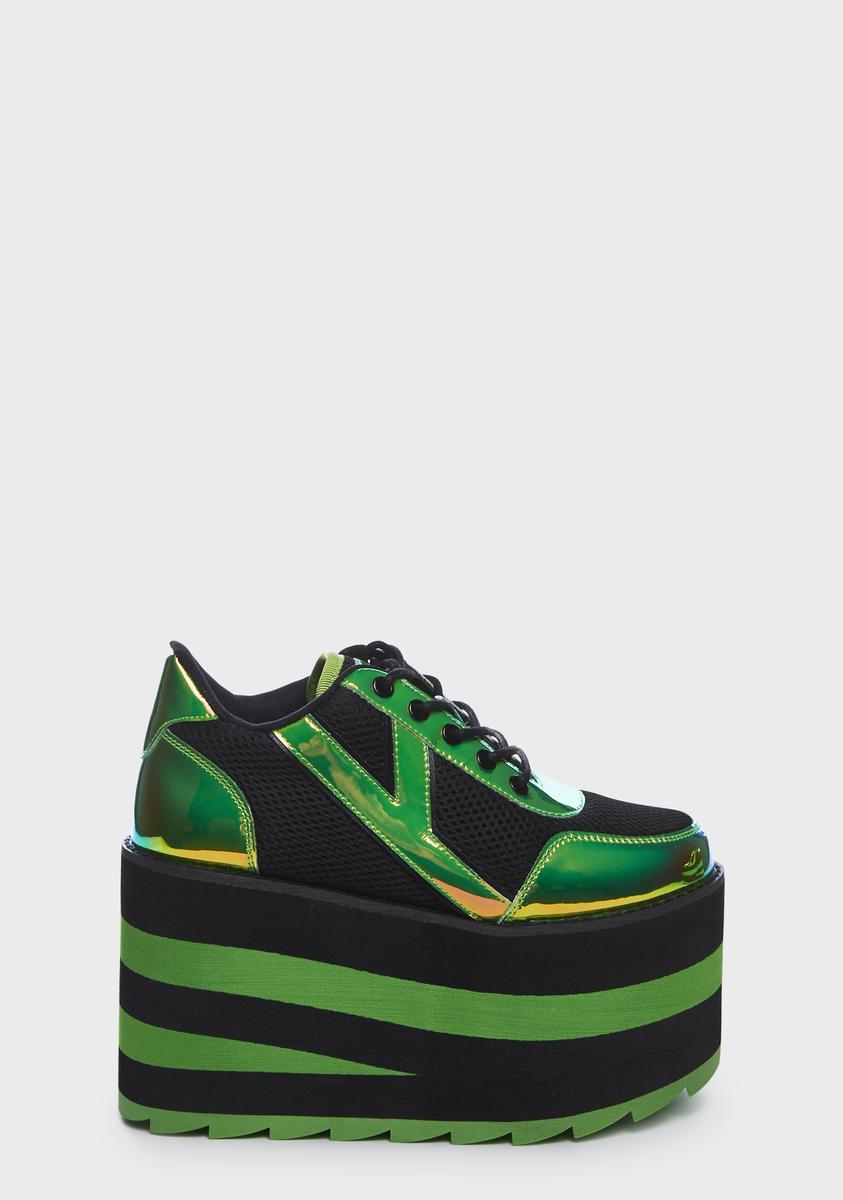 go where the music takes you. These platform sneakers have a vegan leather and mesh construction, contrast-colored stripes and detailing, holographic panels, adjustable lace-up ties, and rubber treaded soles.