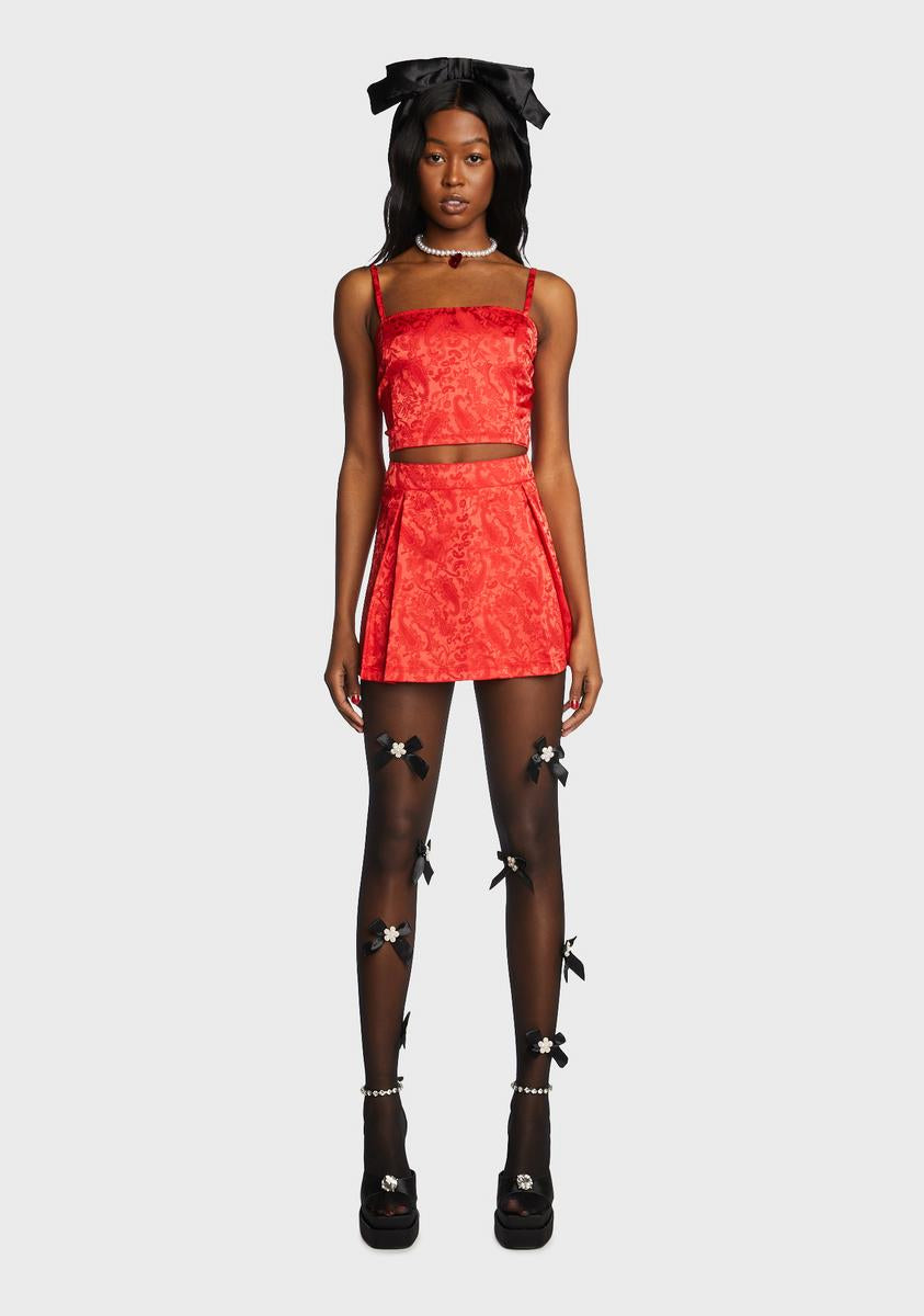 got you feelin' safe and secure! This 2-piece set has a brocade construction, adjustable shoulder straps, and a zip closure. Includes a cropped tank top with a stretchy smocked back and a high-waisted pleated mini skirt.