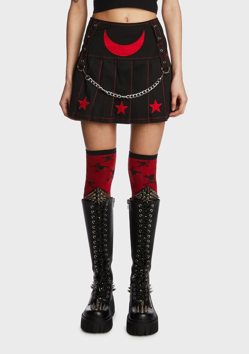 put it out in the universe. This skirt comes in a pleated twill construction, with moon and star print details, grommet details, a removable chain detail, and a zip closure.