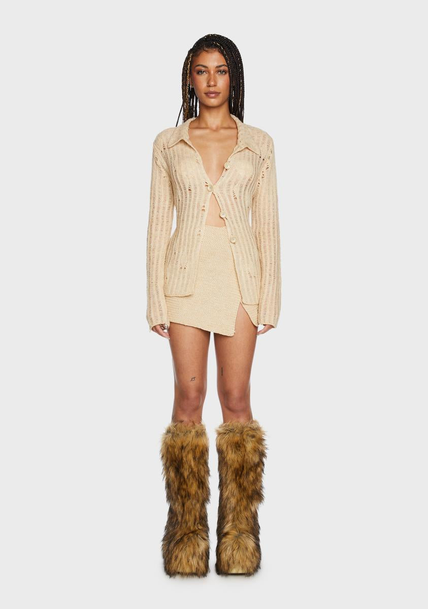 cuz you have arrived. This two-piece set has a distressed knit construction, button closures, and a high waist fit. Includes a long sleeve shirt and a matching skirt.