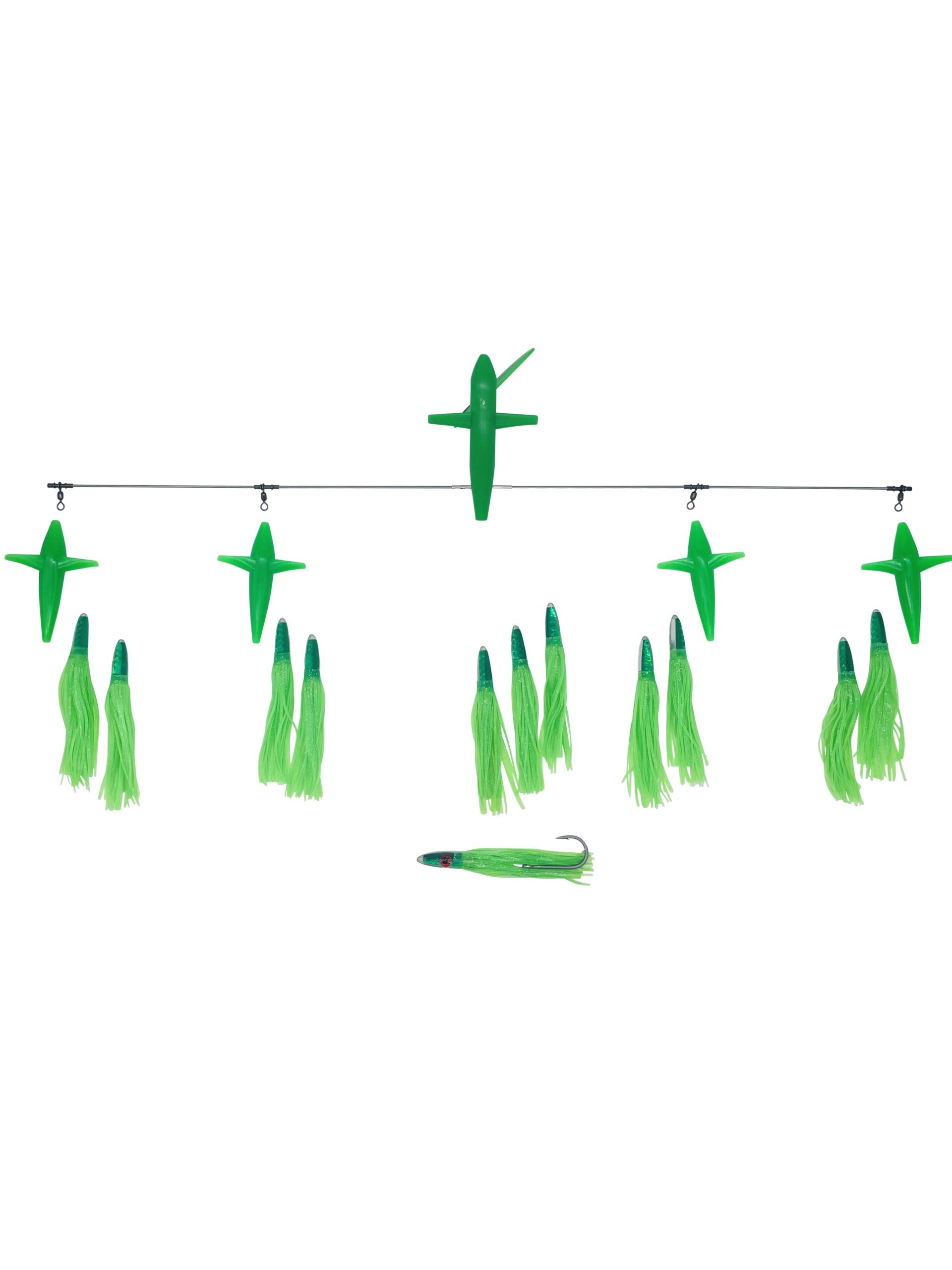 - (11) 6″ Machine Series Squid 2-2-3-2-2 + Stinger Design. (1) Free Spinning chatter bird per teaser line.