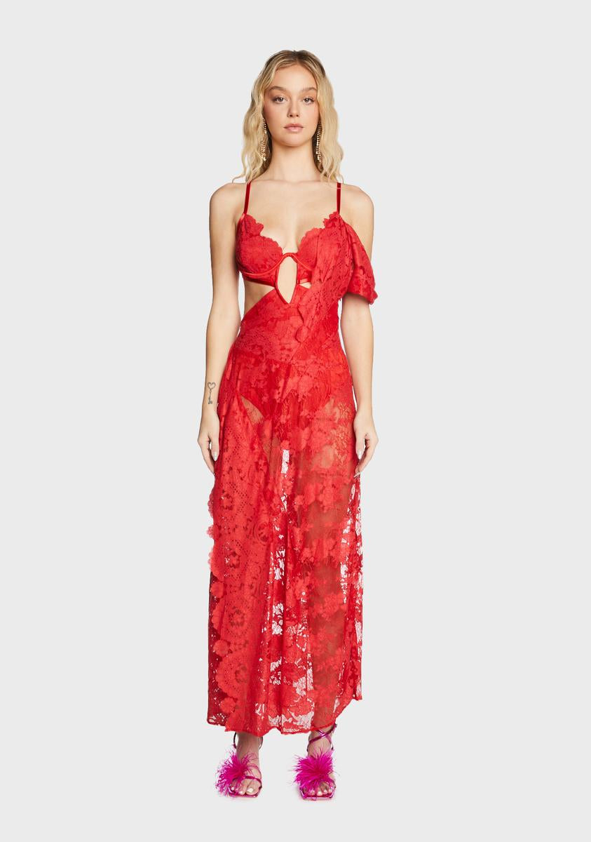 for turnin' up the heat! This maxi dress has a lace construction, underwire bust cups, draped sides, a thigh-high side slit, scalloped trim, a front cutout, back G-hook closures, adjustable shoulder straps, and a stretchy satin bodysuit underneath.