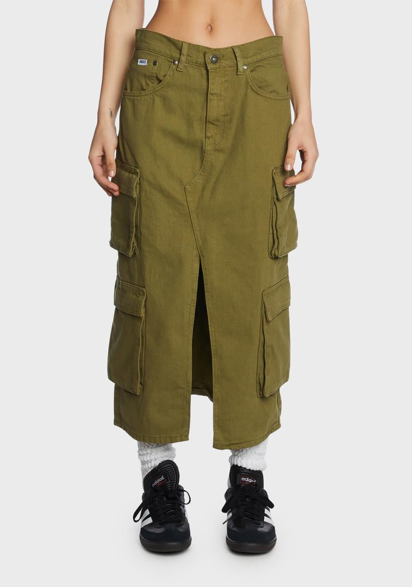 make it pop! This denim midi skirt has cargo pockets, a front slit detail, and a zip-fly closure.