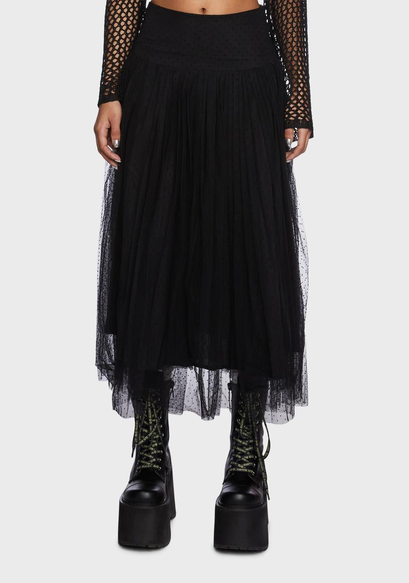 cuz make your thoughts known. This maxi skirt has a tulle construction, a swiss dot pattern, a mid waist fit, and an elastic waistband.