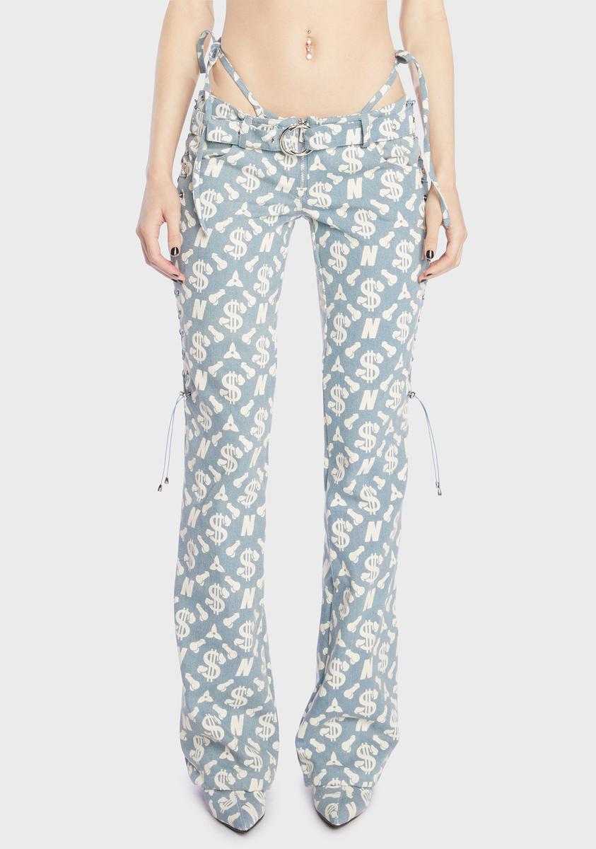 cuz you're feelin' rowdy. These low rise denim jeans have a detachable thong panty, a belted waistline, lace-up details on the sides, slightly flared leg openings, pockets on the front and back, and a dick dollar sign print all over.