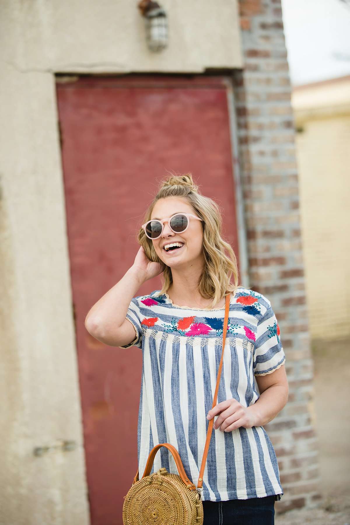 ?Just in time for the sun, the Nautical Striped Floral Top is here! This modest women's short sleeve top has beautiful embroidered flowers set on a classic striped top! Paired with your modest, long denim or midi skirts, this ladies top is perfect for a sweet, summer style!