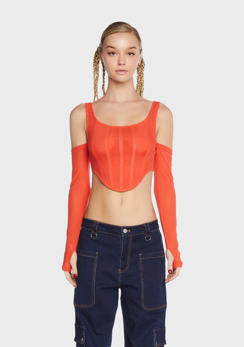 cuz you stand out from the crowd. This long sleeve corset top has a mesh construction, a cold shoulder design, thumbhole cuffs, and a back zip closure.