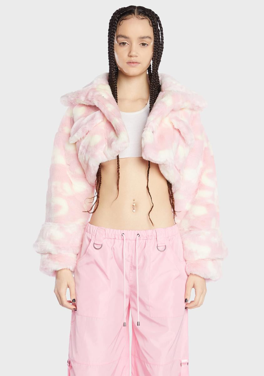 give 'em y2k vibes. This faux fur jacket has a cropped fit, two front pockets, snap button closures, and a dick dollar sign print all over.