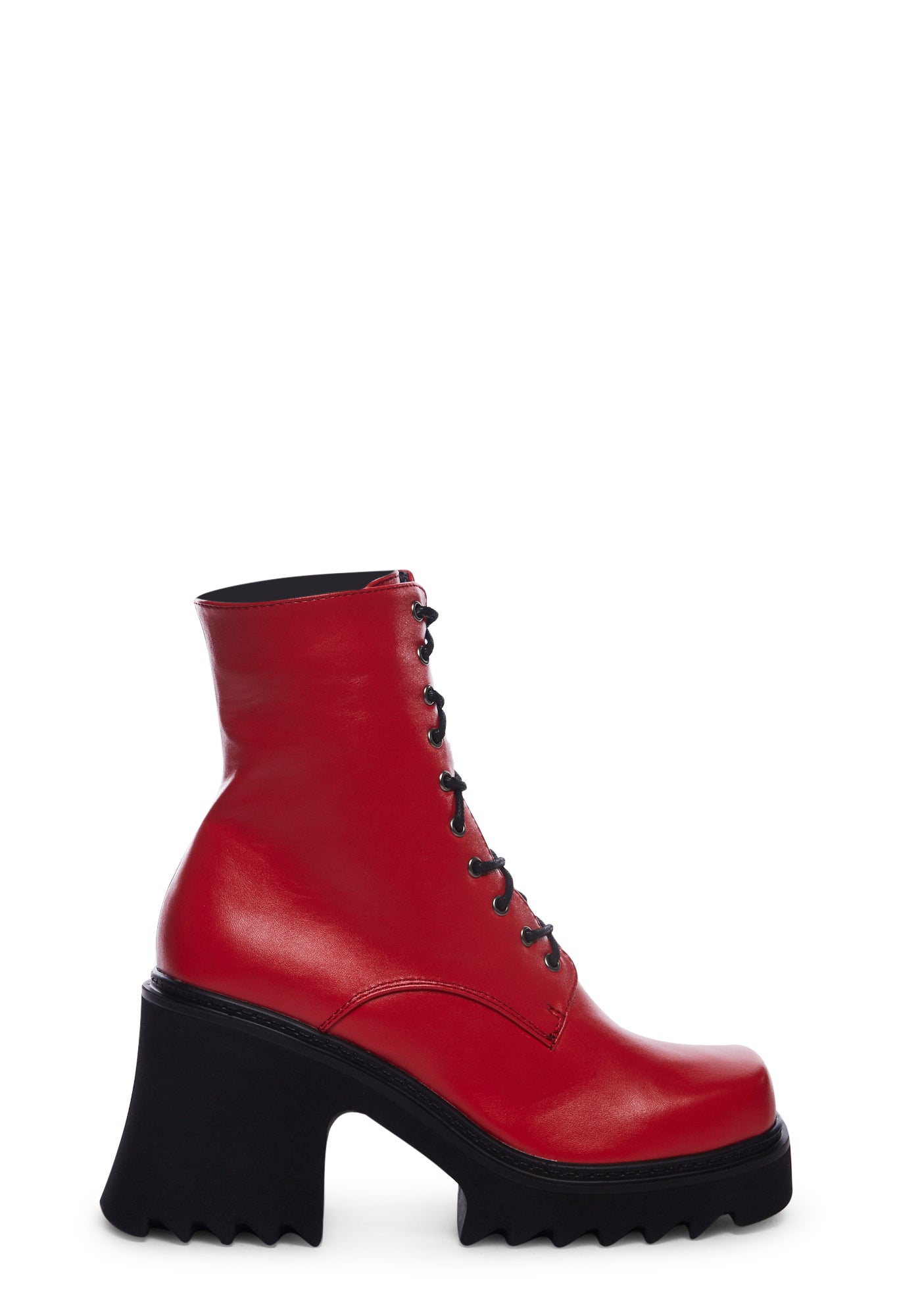 have a vegan leather construction, shark's teeth soles, front lace ups, and side zipper closures.