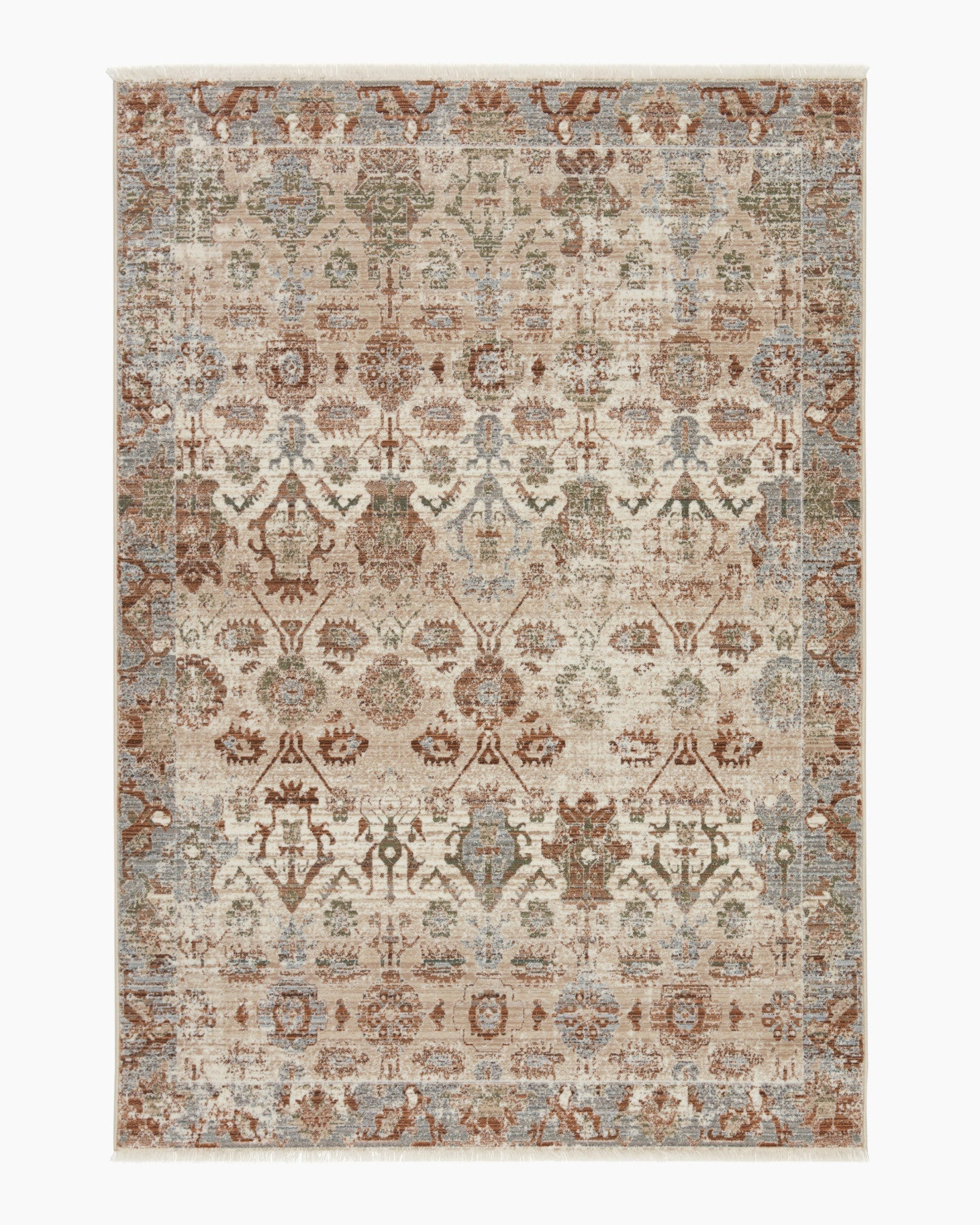 Inspired by the beauty of vintage sun-bathed Turkish designs, the Rhys rug showcases detailed traditional motifs that have been updated with on-trend, saturated colorways. This rug has a distressed lattice pattern in warm tones of beige, tan, green, and rust with hints of cool gray. It features cotton fringe detailing, a natural result of weft yarns, that echoes hand-knotted construction and adds brilliant texture to the plush and durable polypropylene pile.