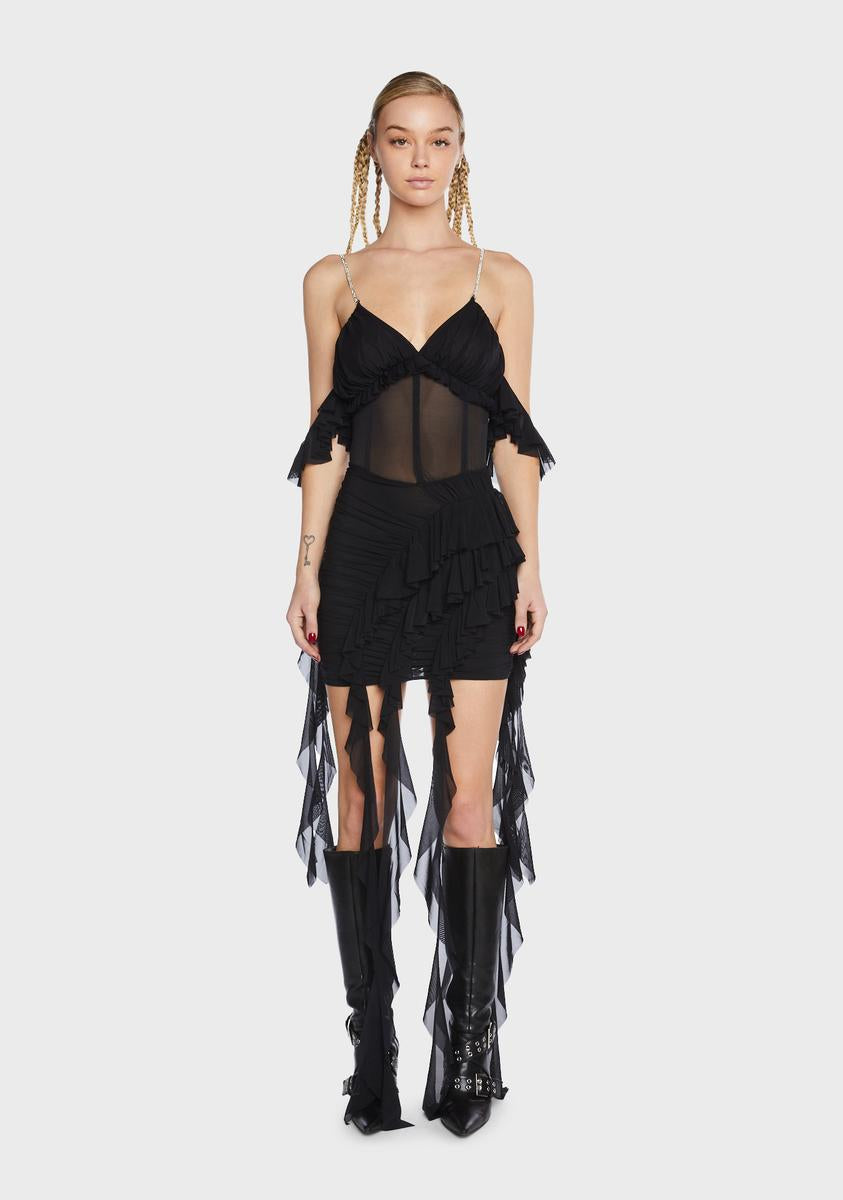 got the paparazzi on your tail! This mini dress has a ruched and sheer mesh construction, ruffle trim all over, adjustable rhinestone shoulder straps, and a back zip closure.