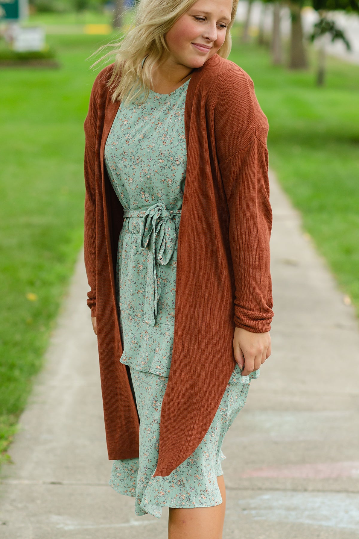 Long,?lightweight cardigans paired with?your favorite dresses and below the knee skirts are just all the things! We love this Rust Knit Cozy Cardigan and how stretchy and?easy it is to move in!?The?side slits and?open front give this?a classic and fresh style that could ultimately pair with anything in your?closet!