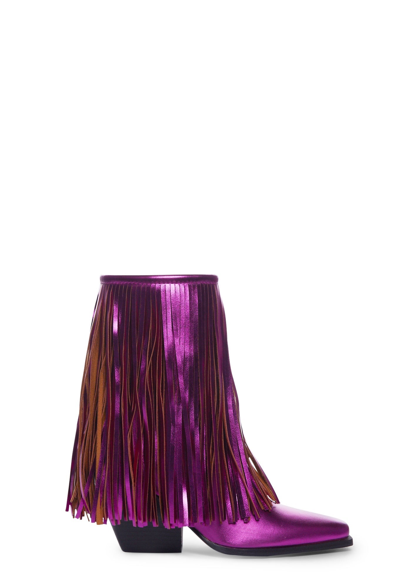 cuz make yourself known. These boots have a vegan leather construction, a metallic finish, fringe detailing, and side zipper closures.