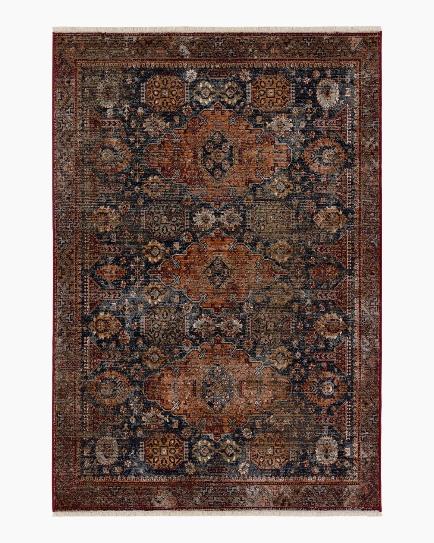 Inspired by the beauty of vintage sun-bathed Turkish designs, the Schuyler rug showcases detailed traditional motifs that have been updated with on-trend, saturated colorways. This rug has a distressed traditional pattern in rich tones of black, navy, gold, orange, and gray. It features cotton fringe detailing, a natural result of weft yarns, that echoes hand-knotted construction and adds brilliant texture to the plush and durable polypropylene pile.