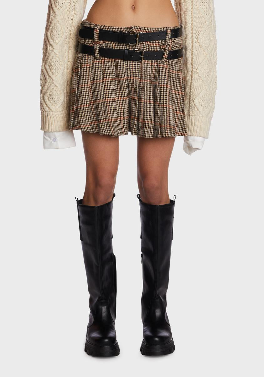 cuz whatever. This mini skirt has a pleated design, a plaid pattern, a low waist fit, and double vegan leather buckle closures.