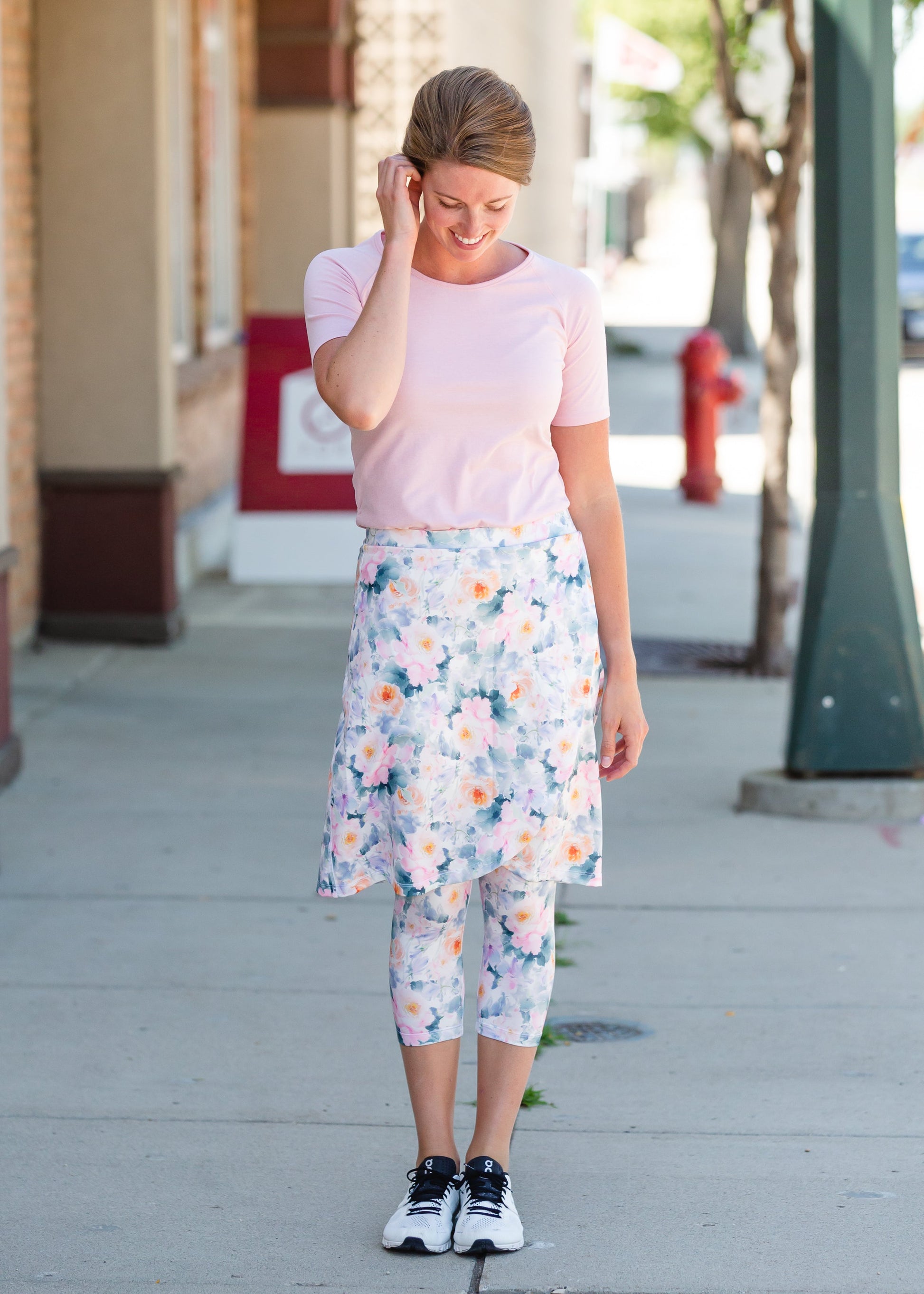 The?Snoga Floral Faux Wrap Sport Skirt?design was created for women who want to dress modestly yet require a complete range of motion.?Solid colored leggings make for the perfect contrast with the printed skirt.?This faux wrap is perfect for biking, hiking, rock climbing, Barre class, or just running around the house. This style is especially flattering and feels great on?most body types. The ? length attached leggings make activities care-free. (Think flipping your leg over a Bicycle.) The fabric is chlorine safe and dries quickly.