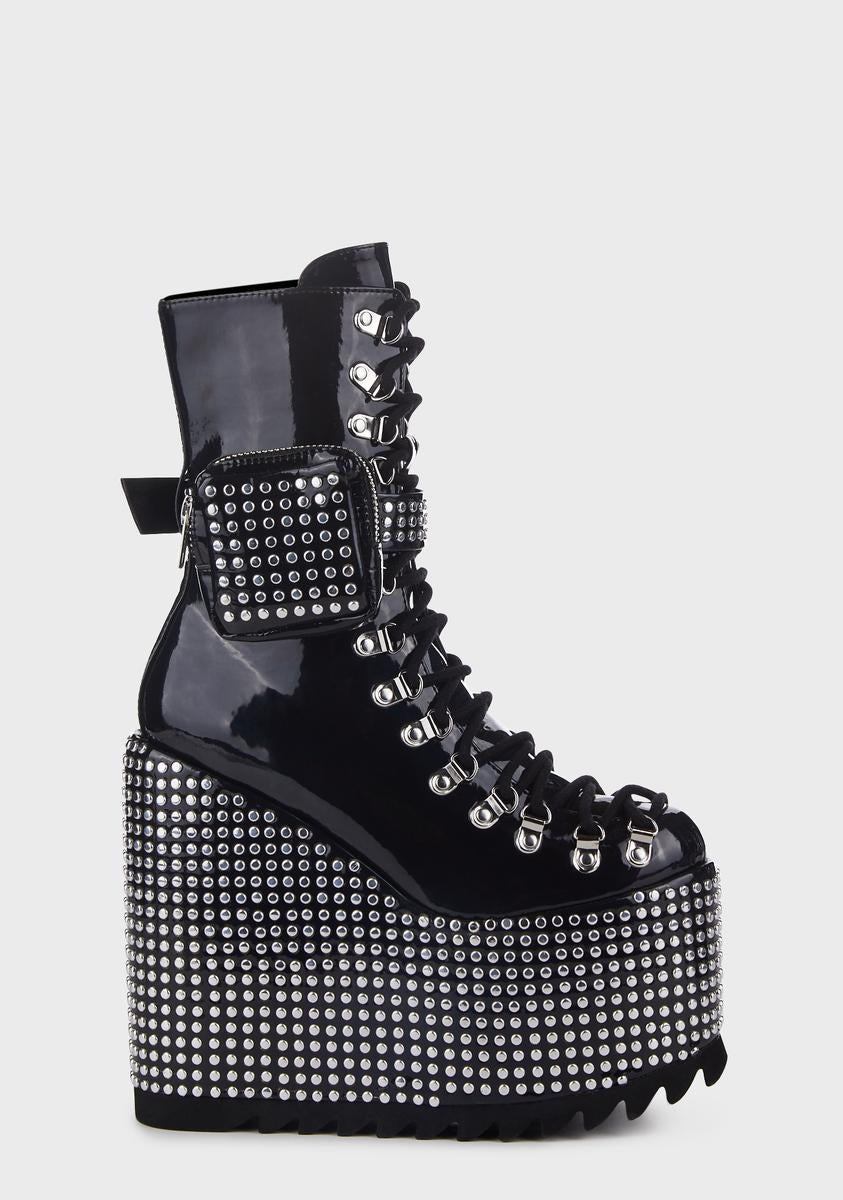 cuz you stay ready. These studded wedge platform boots have a patent vegan leather construction, rubber treaded outsoles, detachable zippered pocket straps, adjustable D-ring lace-ups, and side zip closures.