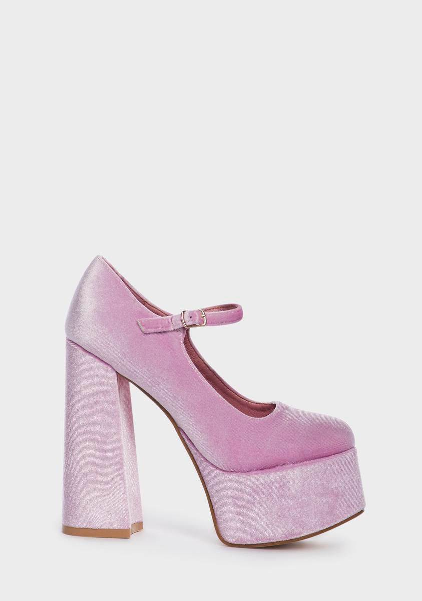 cuz watch me. These mary janes have a velvet construction, platform soles, block heels, and adjustable buckle closures.