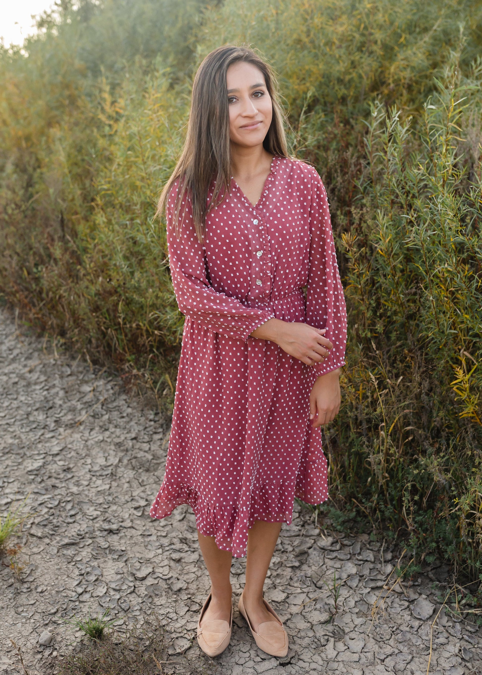 Stop and add some Polka Dot! The Swiss Dot Terracotta 3/4 Sleeve Midi Dress!! A modest, v-neckline, flowy?3/4 sleeves, functioning buttons down the bodice,a ruffle on the hem - this dress is perfection and will perfect as-is and of course layered with tights, cardigans and any jean jacket you wish!