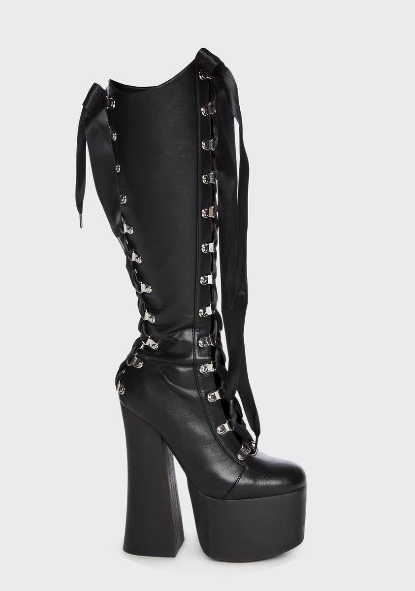 for keepin' your heart closely guarded. These knee-high boots have a vegan leather construction, front cutouts, lace-up ribbon ties at front and back, square toes, side zip closures, and slightly-flared tall block heels.