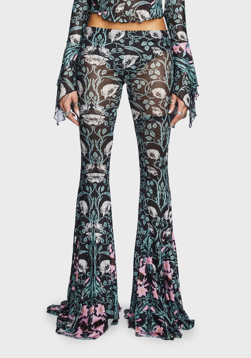 cuz a witch bows to no man. These pants have a stretchy mesh construction, an all over floral print, sewn in underwear, a low waist fit, and a flared leg silhouette.