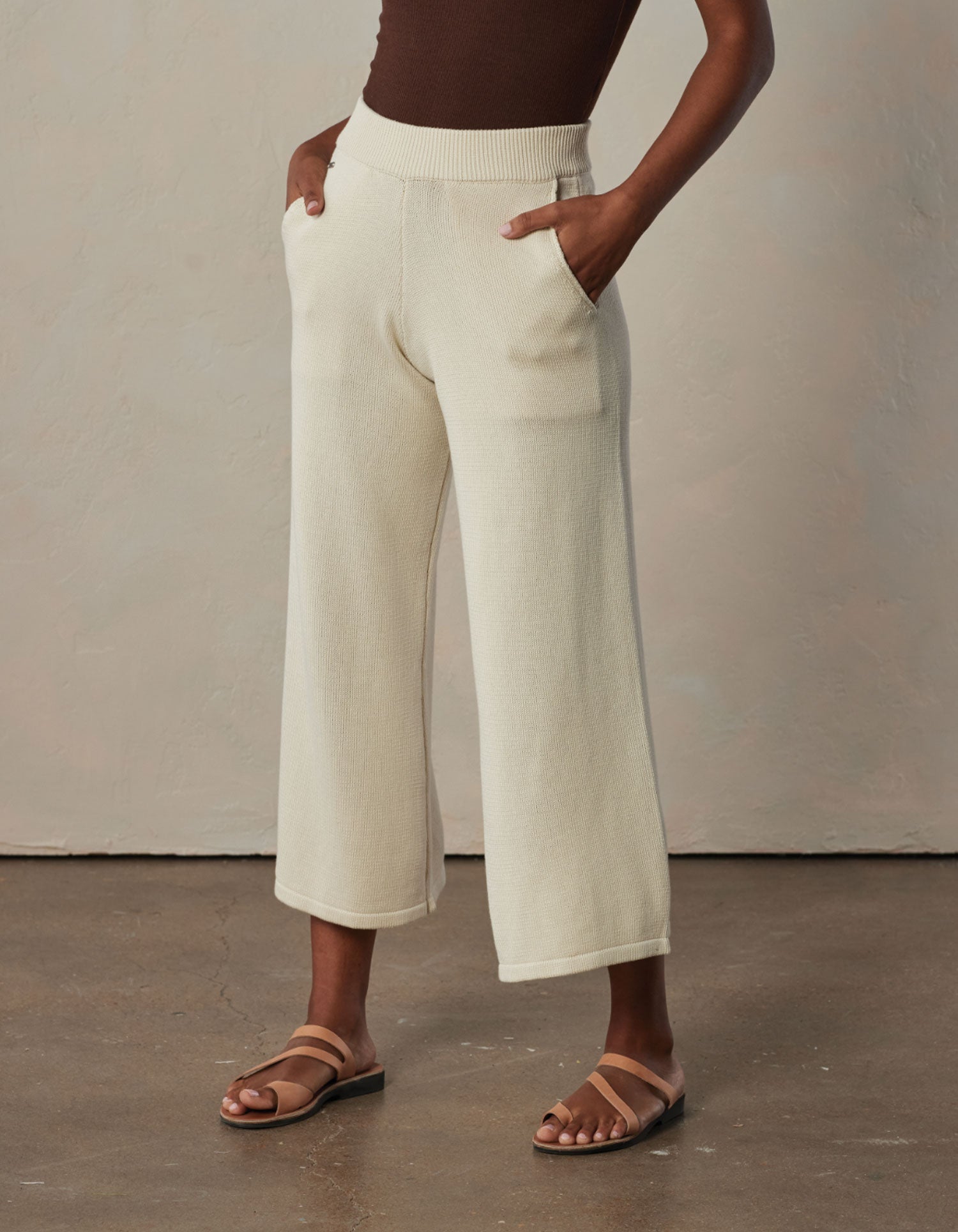 These pants feature a thicker gauge yarn in a jersey sweater knit, making them perfect for getting comfy. They're exceptionally soft and breathable for all-day wear. The rib elastic waistband and front pockets perfectly combine style and function. With a cropped inseam of 24.5" and a wide leg design, these pants are a versatile addition to your wardrobe.