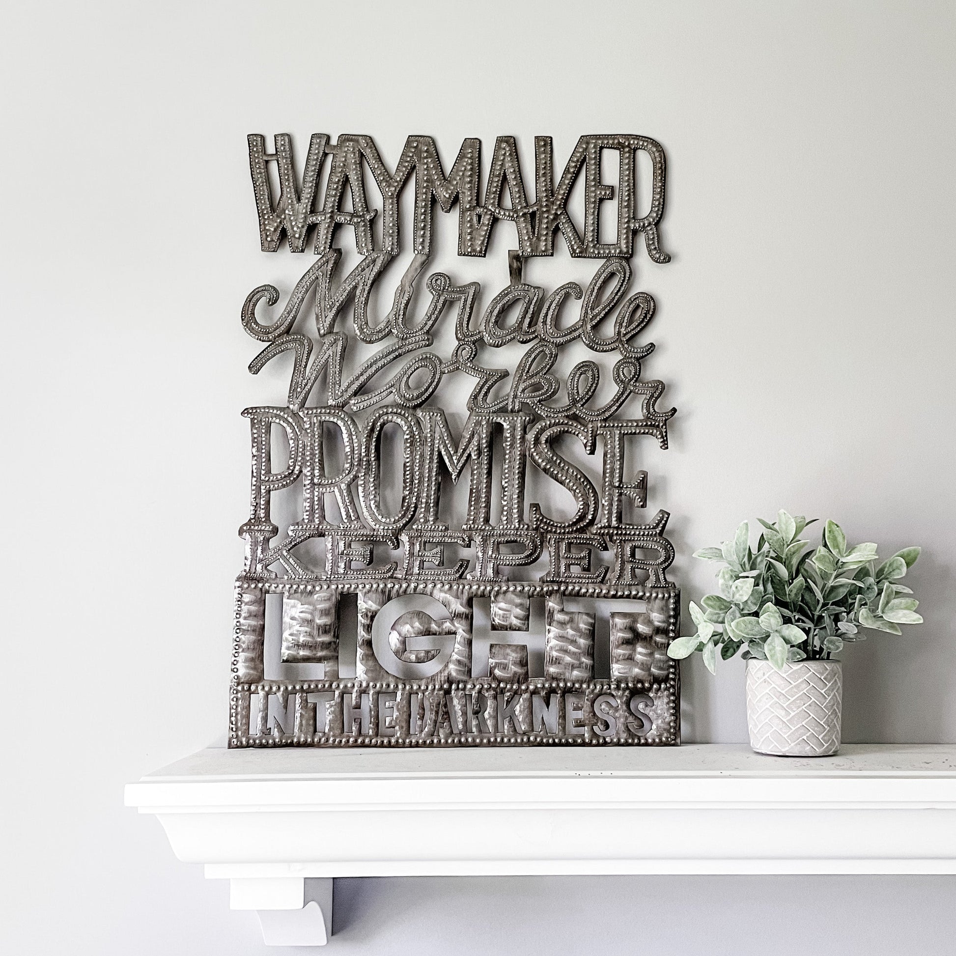 Waymaker, Miracle Worker, Promise Keeper, Light in the Darkness. Display this handcrafted oil drum art wherever you need the reminder of God’s promises and faithfulness to those who call upon Him.