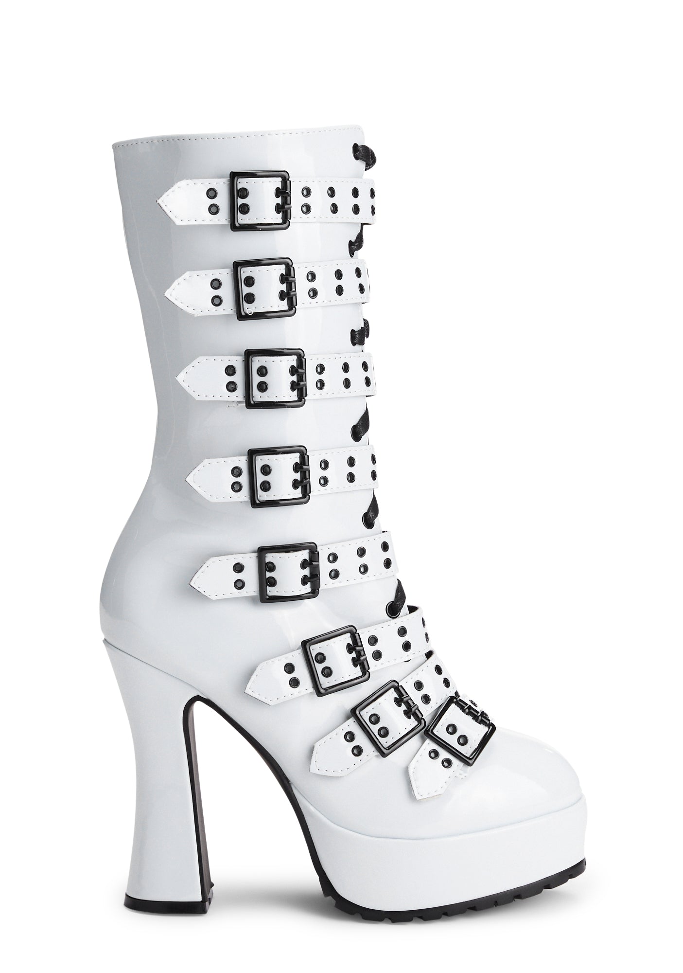 cuz be your own boss. These boots have a patent vegan leather construction, treaded platform soles, block heels, buckle detailing, and side zipper closures.