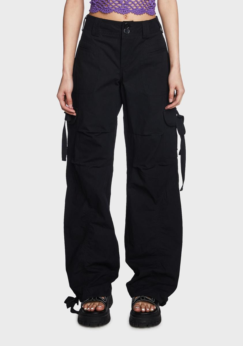 cuz that's just how you roll, babe. These twill cargo pants have a baggy low rise fit, cargo pockets with long strap details, adjustable drawstring ties at the cuffs, and a zip-fly with double button closures.