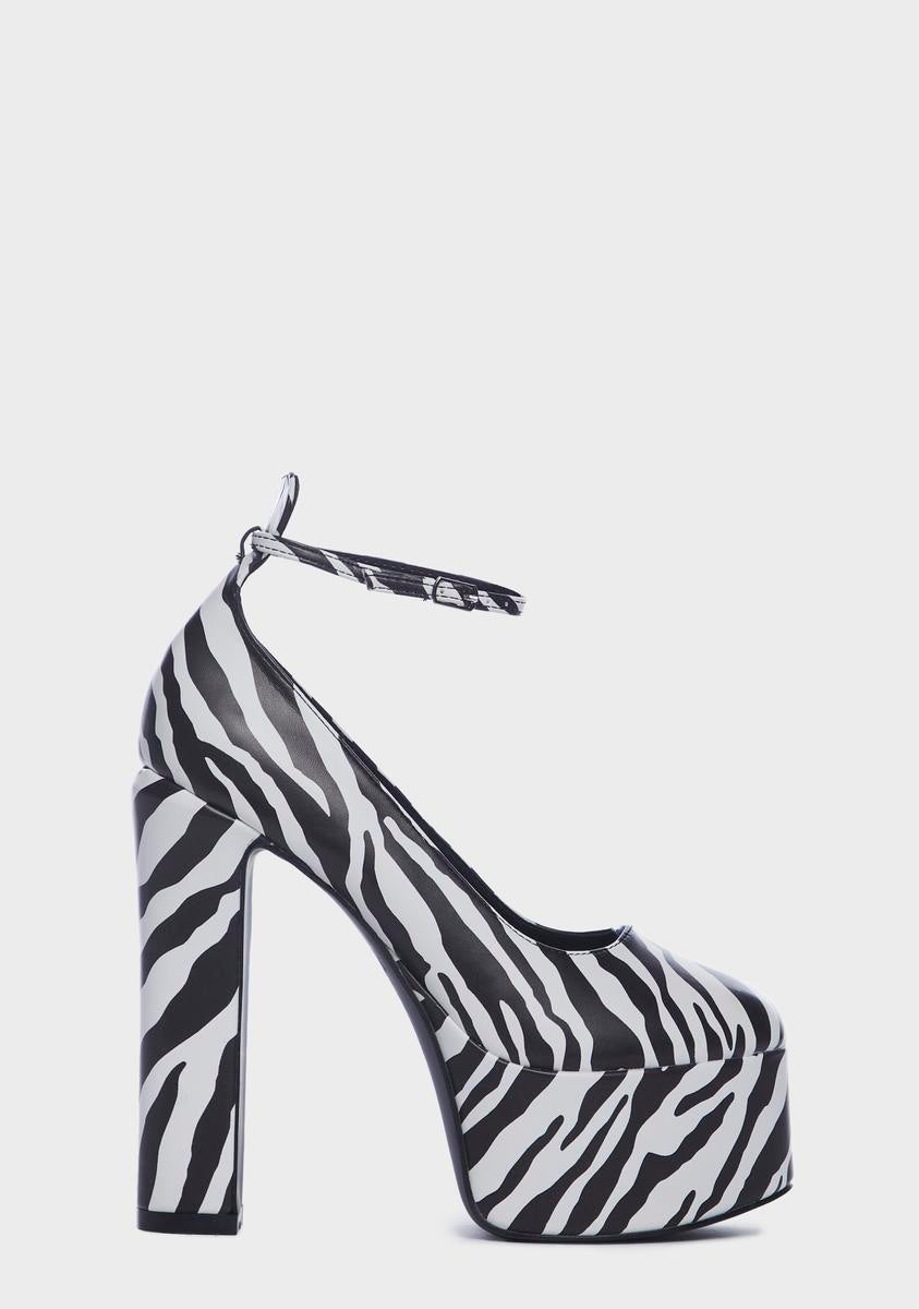cuz you make everything better. These platform heels have a vegan leather construction, a zebra print all over, adjustable buckled ankle straps, and tall block heels.